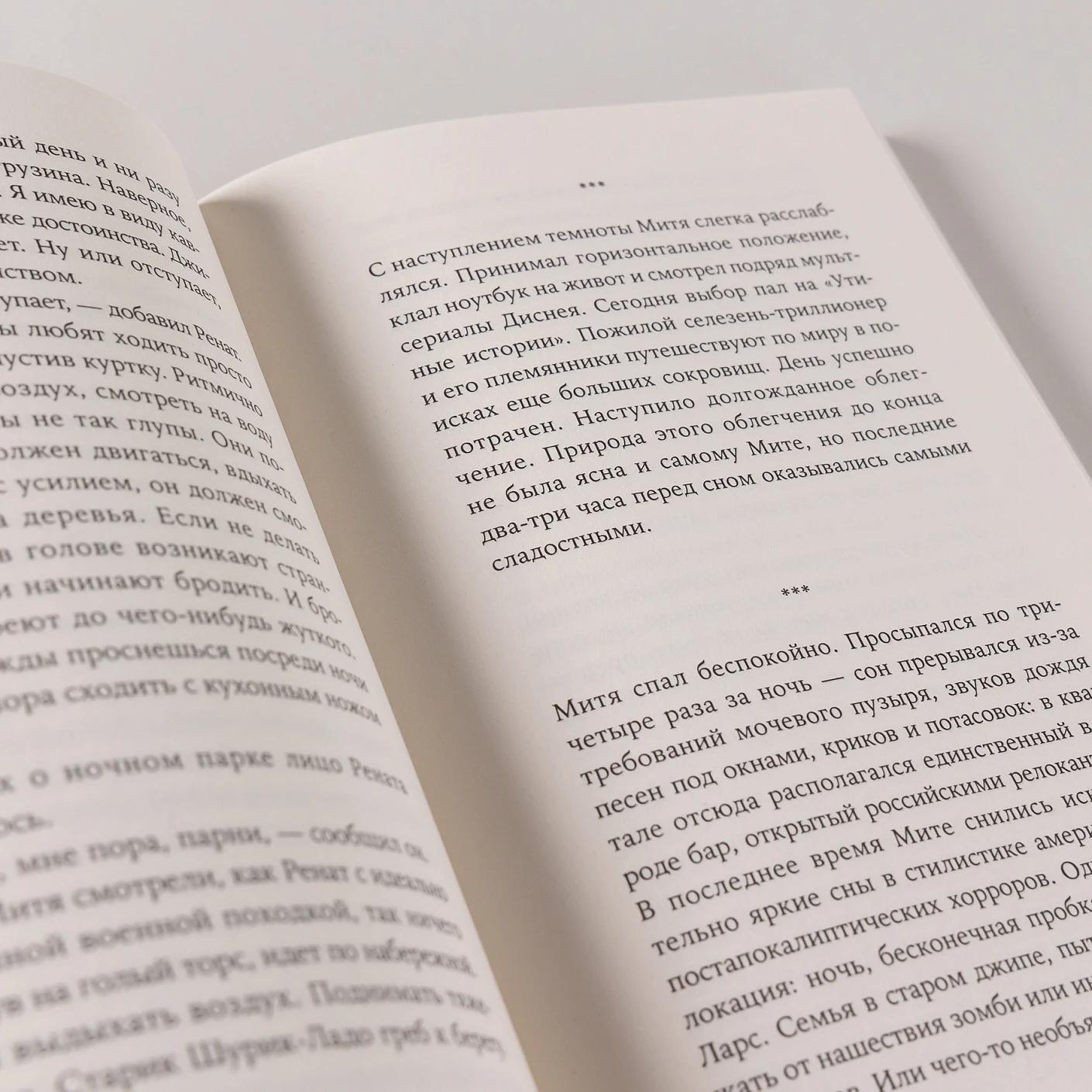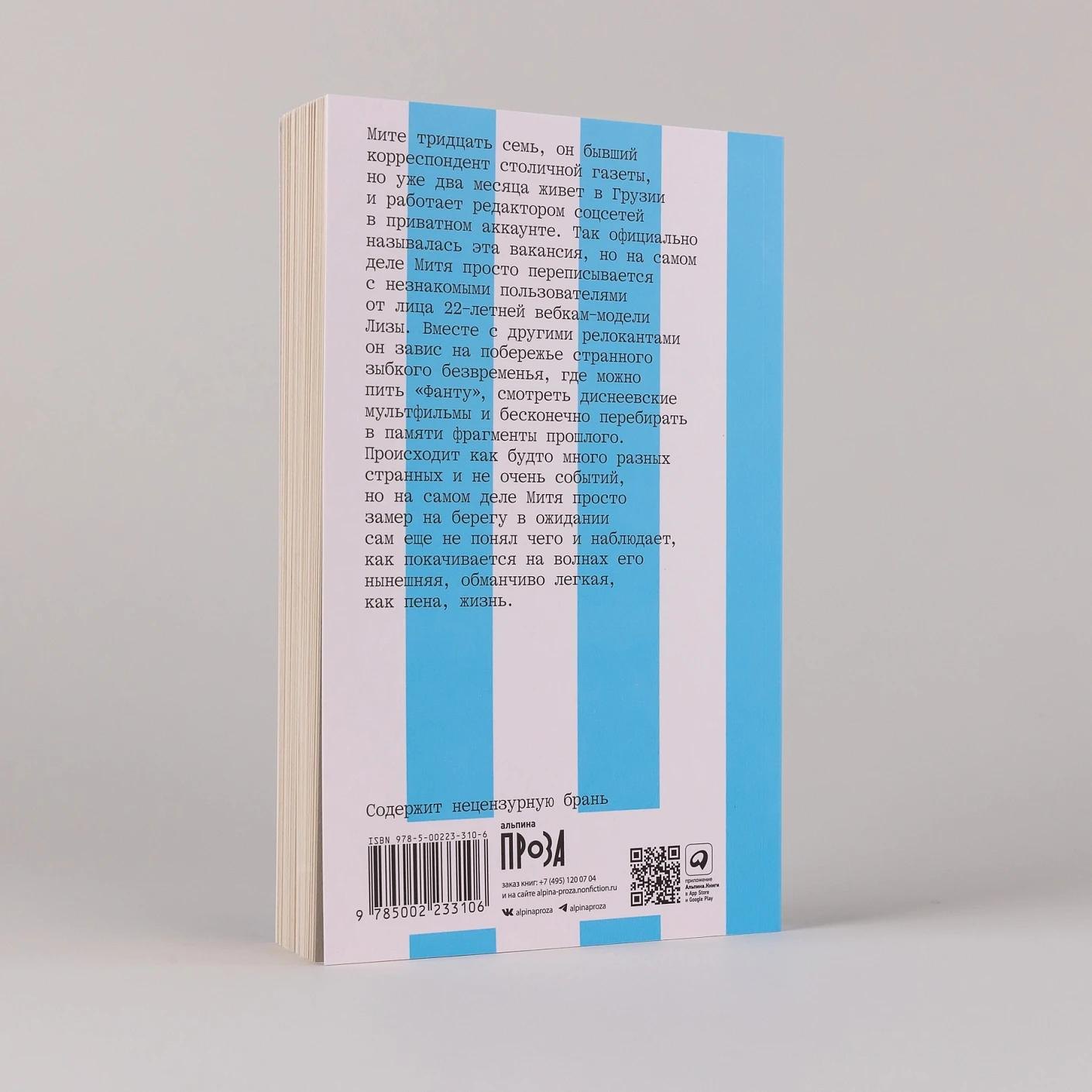Мите тридцать семь, он бывший корреспондент столичной газеты, но уже два месяца живет в Грузии и работает редактором соцсетей в приватном аккаунте. Так официально называлась эта вакансия, но на самом деле Митя просто переписывается с незнакомыми пользователями от лица двадцатидвухлетней вебкам-модели Лизы. Вместе с другими релокантами он завис на побережье странного зыбкого безвременья, где можно пить «Фанту», смотреть диснеевские мультфильмы и бесконечно перебирать в памяти фрагменты прошлого. Происходит как будто много разных странных и не очень событий, но на самом деле Митя просто замер на берегу в ожидании сам еще не понял чего и наблюдает, как покачивается на волнах его нынешняя, обманчиво легкая, как пена, жизнь.