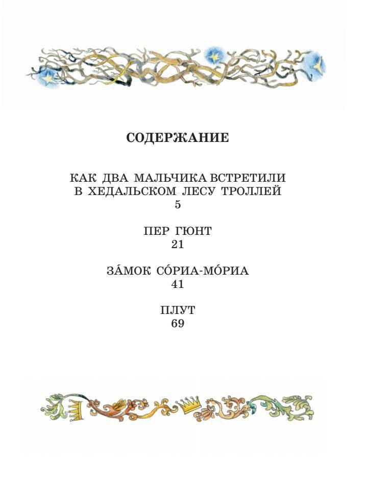 В книгу вошли четыре сказки – «Как два мальчика встретили в Хедальском лесу троллей», «Пер Гюнт», «Замок Сориа-Мориа» и «Плут» в классическом переводе А. Любарской.
