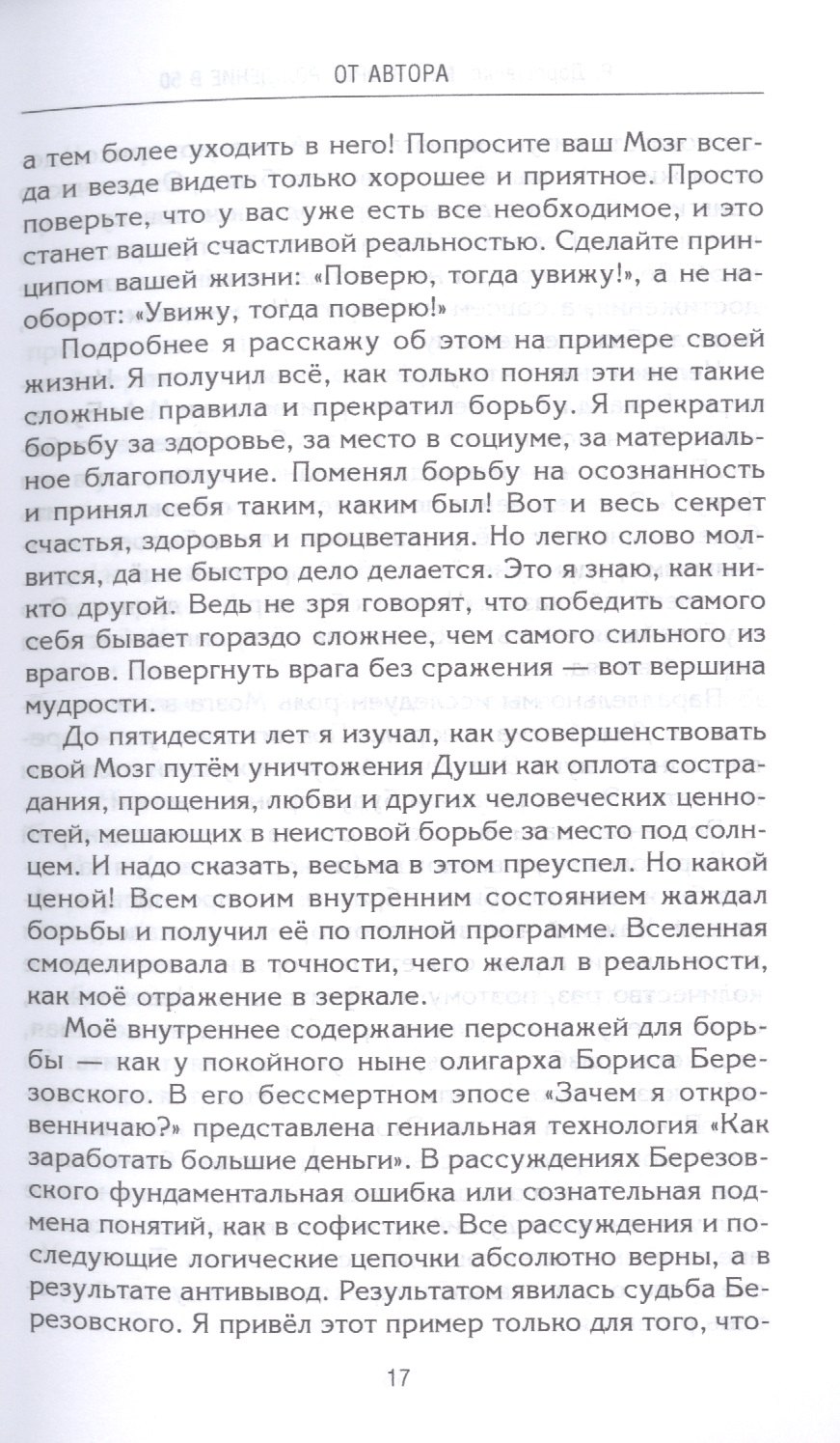 Автор этой книги рассказывает невероятную но тем не менее невыдуманную историю своей жизни. Долгие годы Роберт, альтер-эго автора, всё больше и больше погружался в саморазрушение. Его терзали болезни, его губил алкоголизм, ему не давало отдыха стремление к мирским благам. Три раза ему грозила гибель, и три раза он чудом оставался в живых. И, как в сказке, третий раз принёс ему прозрение. Поработав с духовным учителем, он смог спасти свою летевшую под откос жизнь, выработав правила гармоничного существования, примиряющего друг с другом неугомонный Мозг, толкающий человека на свершения в материальном мире, и Душу, жаждущую нравственного совершенствования. И теперь ты, читатель, можешь гармонизировать свою жизнь, воспользовавшись методикой автора, доставшейся ему потом и кровью. Когда ученик готов, учитель приходит сам, и если тебе в руки попала эта книга, значит, она тебе действительно нужна.