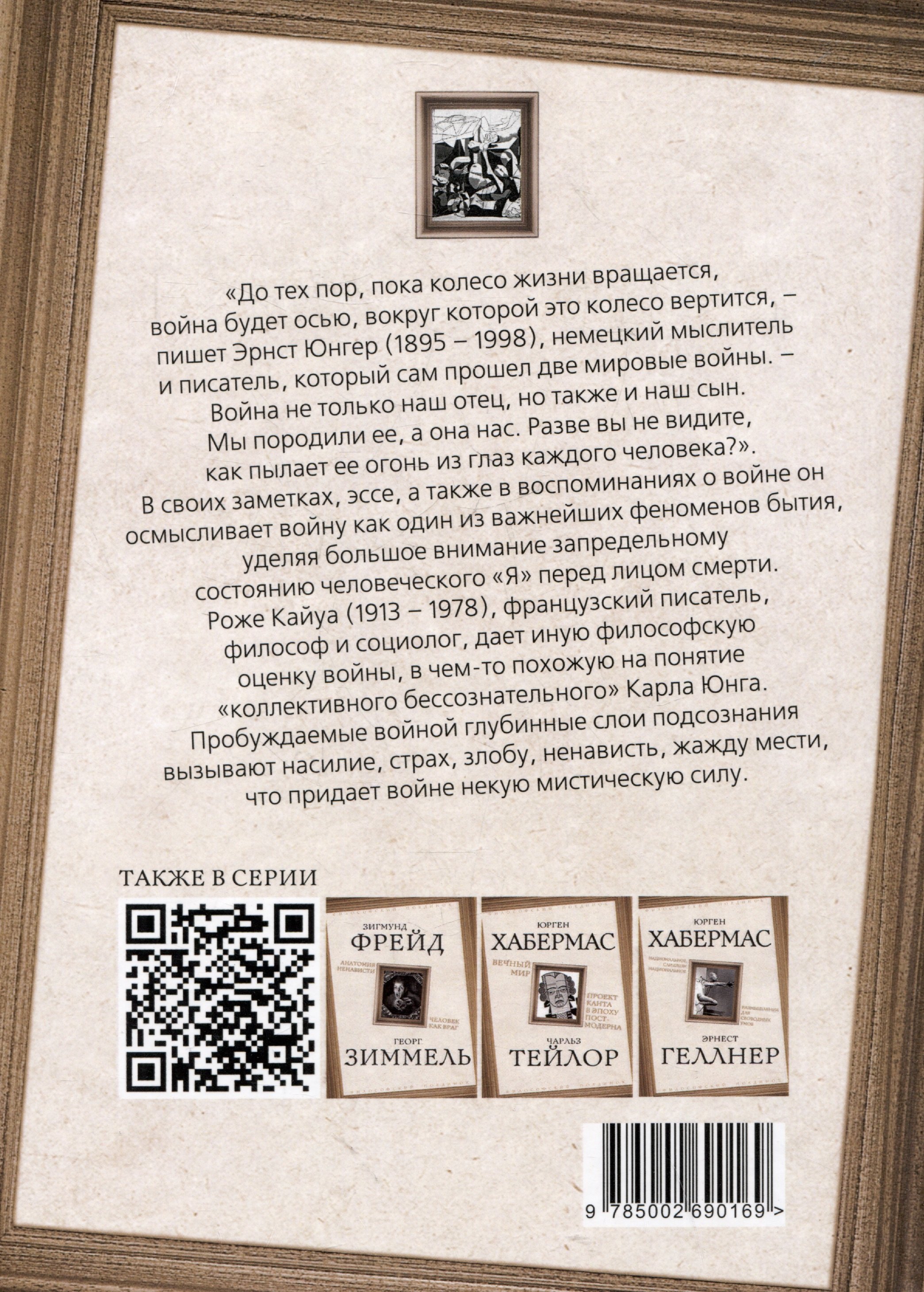 «До тех пор, пока колесо жизни вращается, война будет осью, вокруг которой это колесо вертится, – пишет Эрнст Юнгер (1895 – 1998), немецкий мыслитель и писатель, который сам прошел две мировые войны. – Война не только наш отец, но также и наш сын. Мы породили ее, а она нас. Разве вы не видите, как пылает ее огонь из глаз каждого человека?». В своих заметках, эссе, а также в воспоминаниях о войне он осмысливает войну как один из важнейших феноменов бытия, уделяя большое внимание запредельному состоянию человеческого «Я» перед лицом смерти. Роже Кайуа (1913 – 1978), французский писатель, философ и социолог, дает иную философскую оценку войны, в чем-то похожую на понятие «коллективного бессознательного» Карла Юнга. Пробуждаемые войной глубинные слои подсознания вызывают насилие, страх, злобу, ненависть, жажду мести, что придает войне некую мистическую силу.