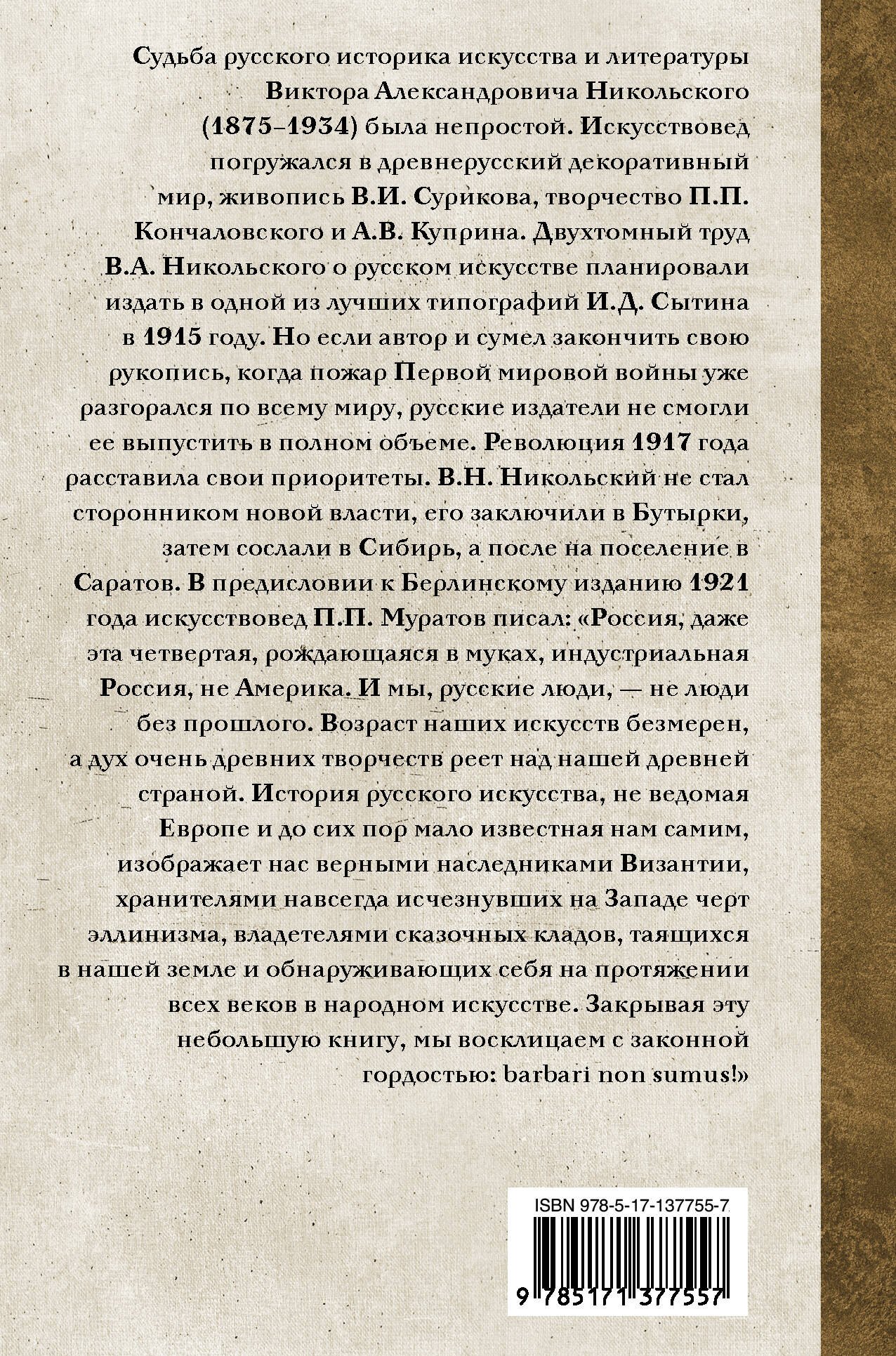 Судьба русского историка искусства и литературы Виктора Александровича Никольского (1875–1934) была непростой. Двухтомный труд В. А. Никольского о русском искусстве планировали издать в одной из лучших типографий И. Д. Сытина в 1915 году. Но если автор и сумел закончить свою рукопись, когда пожар Первой мировой войны уже разгорался по всему миру, русские издатели не смогли ее выпустить в полном объеме. Революция 1917 года расставила свои приоритеты. В. Н. Никольский не стал сторонником новой власти, его заключили в Бутырки, затем сослали в Сибирь, а после на поселение в Саратов. В предисловии к Берлинскому изданию 1921 года искусствовед П. П. Муратов писал: «Россия, даже эта четвертая, рождающаяся в муках, индустриальная Россия, не Америка. И мы, русские люди, – не люди без прошлого. Возраст наших искусств безмерен, а дух очень древних творчеств реет над нашей древней страной. История русского искусства, не ведомая Европе и до сих пор мало известная нам самим, изображает нас верными наследниками Византии, хранителями навсегда исчезнувших на Западе черт эллинизма, владетелями сказочных кладов, таящихся в нашей земле и обнаруживающих себя на протяжении всех веков в народном искусстве. Закрывая эту небольшую книгу, мы восклицаем с законной гордостью: barbari non sumus!».