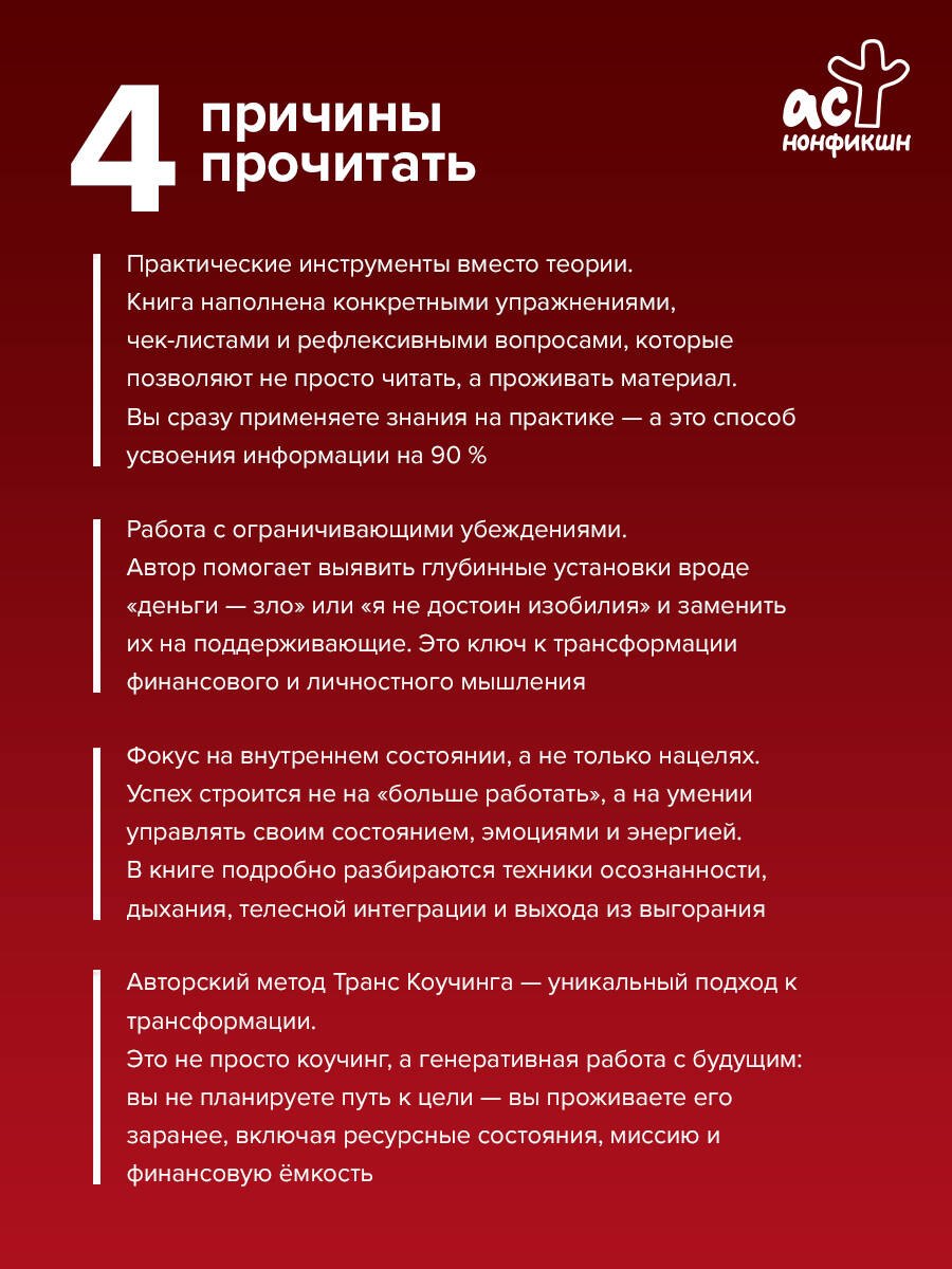 Книга ведёт читателя от раздробленности и неудовлетворённости к силе, ясности и внутреннему балансу через восемь взаимосвязанных векторов жизни: состояние, цели, продуктивность, отдых, финансы (финансовая грамотность), убеждения, продажи и окружение. Изменение в одном из них трансформирует всю систему целиком.