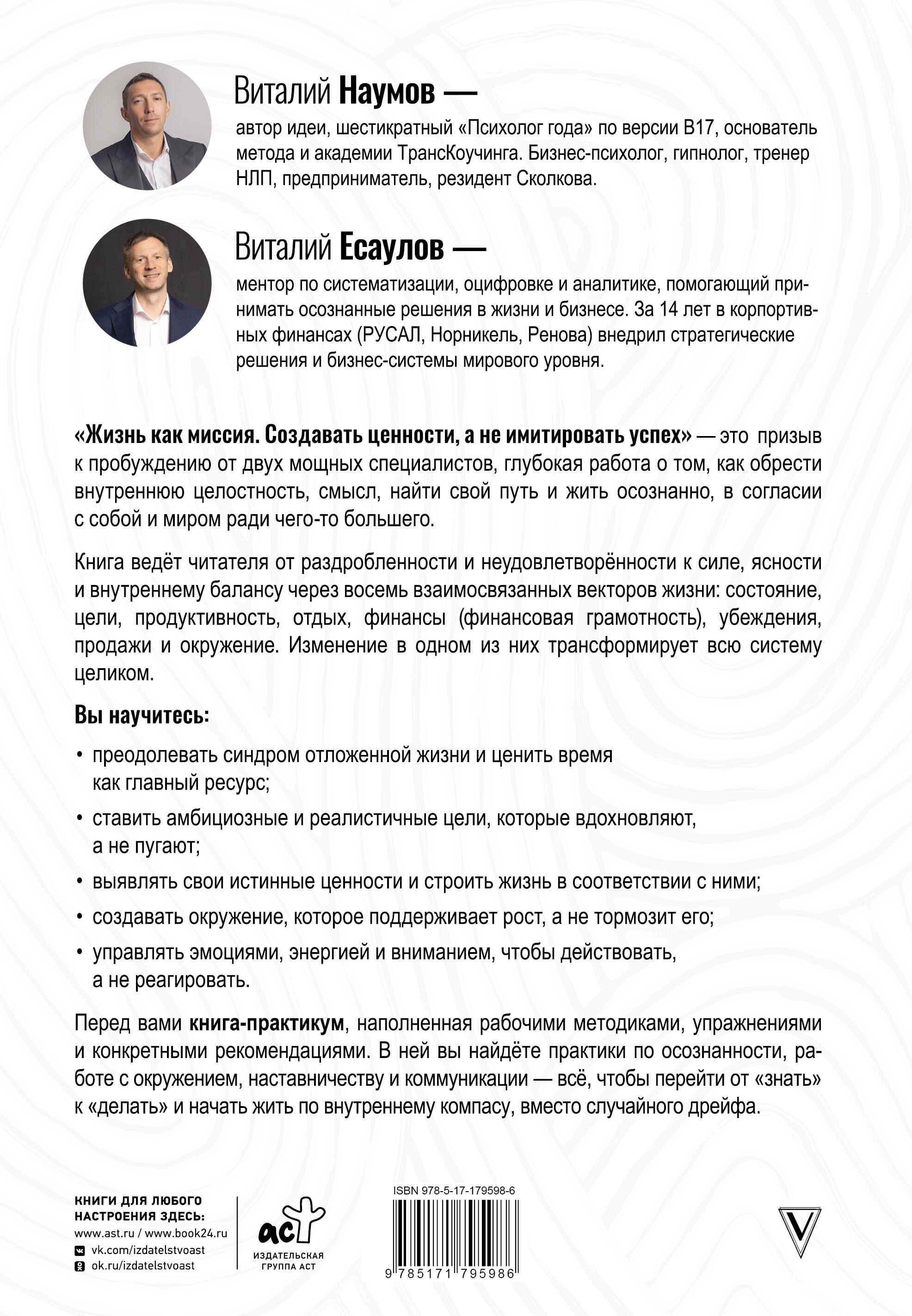 "Жизнь как миссия. Создавать ценности, а не имитировать успех" — это призыв к пробуждению от двух мощных специалистов, глубокая работа о том, как обрести внутреннюю целостность, смысл, найти свой путь и жить осознанно, в согласии с собой и миром ради чего-то большего.